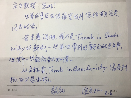图7 学校创始教授涂光炽先生给我咨询相关信息的回信