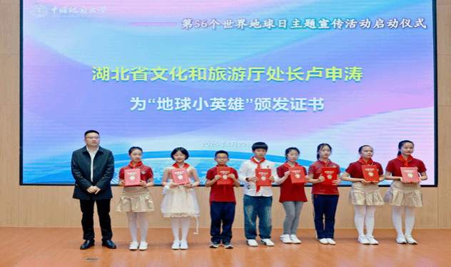 湖北省文化和旅游厅博物馆及社会文物处处长卢申涛为8名“地球小英雄”送上荣誉,他们来自地大附属学校“学雷锋志愿服务队”,在校园志愿活动中积极行动,用稚嫩的双手为保护地球贡献力量。