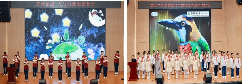 地大附属学校的同学们更是用精彩表演将活动氛围推向高潮。504班同学带来的合唱《世界赠予我的》,歌声清澈悠扬,仿佛将世界的美好一一呈现在众人眼前,赢得阵阵热烈掌声;随后的朗诵《保护地球妈妈》,孩子们用真挚的情感和有力的话语,传递出守护地球的迫切心声,让在场所有人陷入对地球责任的深深思考;505班同学表演的《垃圾分类你我做起》手势舞,动作灵动、精神饱满,以充满创意的方式号召大家成为垃圾分类小能手。学生代表隋欣宸同学宣读“珍爱地球 人与自然和谐共生”倡议书,字字句句都饱含着对地球的热爱与守护决心。