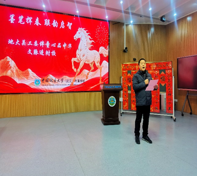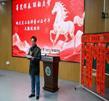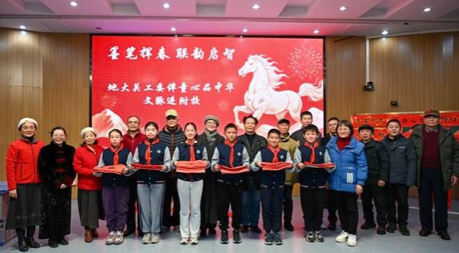 2026年1月6日下午,校关工委、地大附属学校关工委联合校老年协会、校团委、马克思主义学院关工委共同策划举办的“墨笔挥春 联韵启智——地大关工委伴童心品中华文脉进附校”活动在地大附属学校启迪楼阶梯教室成功举行。校关工委办公室常务副主任王莉、中国传统文化宣传团队负责人曾佐勋;马克思主义学院关工委主任、党委书记魏海勇,附属学校关工委主任、党总支书记张延平;大地行吟诗社、校老年协会、大学生代表、附校师生及学生家长代表120余人参加了本次活动。